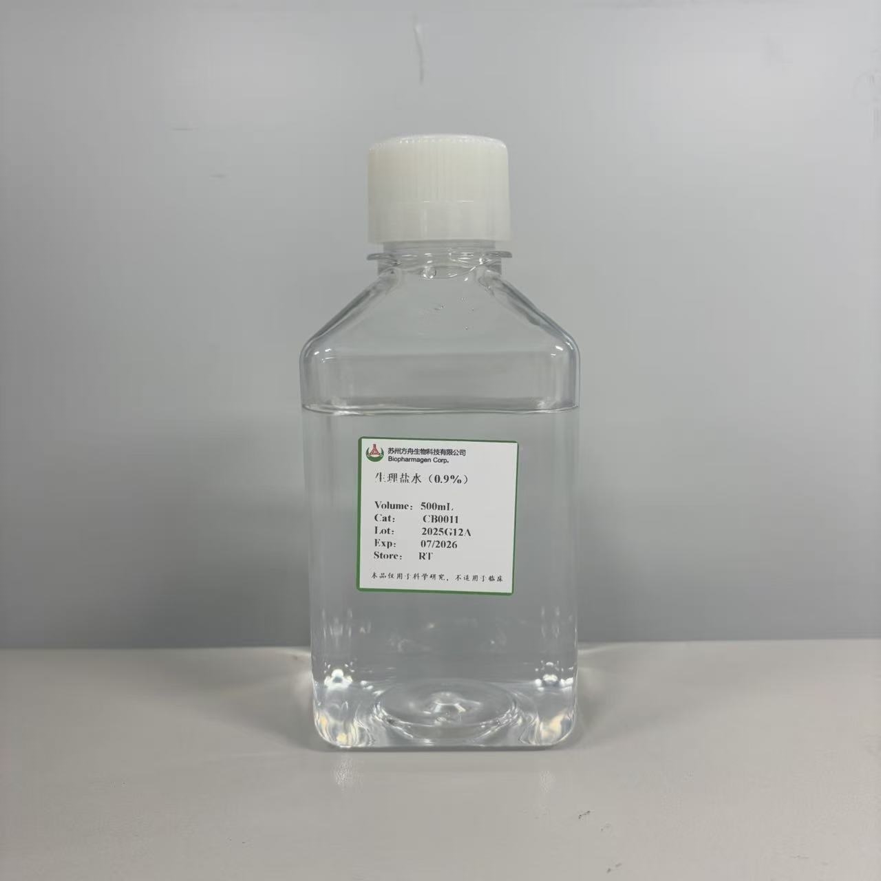 生理盐水(Stroke-Physiological Saline Solution, SPSS),也称为无菌生理盐水,是指渗透压与动物或人体血浆基本相等的氯化钠溶液。其浓度为0.9%(g/mL),在此浓度下溶液的渗透压约为290 mOsm/L,与细胞外液一致,因此在使用过程中不会导致细胞发生渗透性收缩或膨胀,从而最大限度地维持细胞形态和功能的稳定。该溶液经严格的无菌工艺制备,不含热原、颗粒物及其他微生物污染,可安全用于细胞培养过程中的清洗、稀释或作为药物及试剂的载体。此外,它也广泛用于临床输液、伤口冲洗、手术辅助及体外实验体系中,是一种基础的生理学实验和医疗用缓冲溶液。
