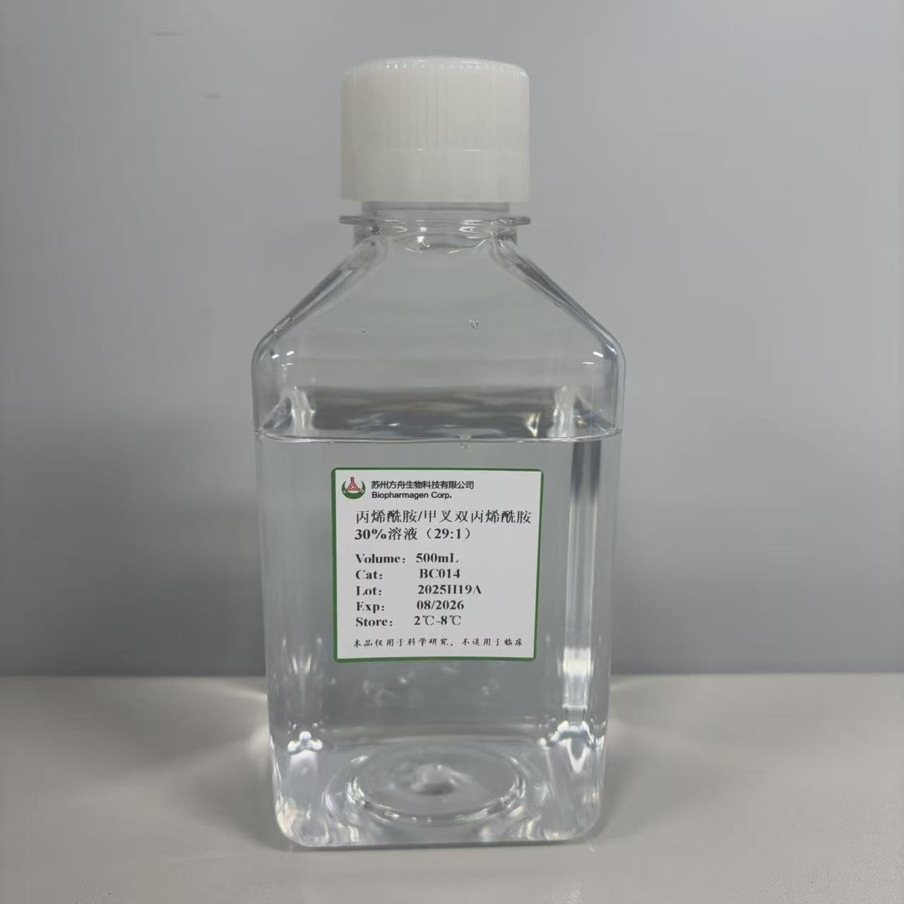30% Acr-Bis (29:1) 溶液是一种广泛用于聚丙烯酰胺凝胶电泳(PAGE)的关键储备液,其中丙烯酰胺(Acr)与N,N'-亚甲基双丙烯酰胺(Bis)以29:1的质量比例混合,总浓度为30%。该比例决定了凝胶的交联密度,直接影响凝胶的孔径大小、机械强度及分离性能。